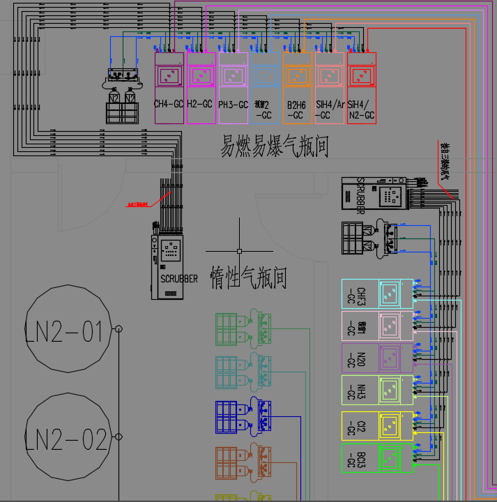 特氣系統(tǒng),尤其是集中供氣系統(tǒng)引入國內(nèi)的時間并不長,相應(yīng)的設(shè)備、施工方法、經(jīng)驗多是從歐美等發(fā)達國家延伸而來。我們可以參考美國ASTM給出的相應(yīng)標準,目前國內(nèi)標準也在逐步完善當中。隨著半導(dǎo)體行業(yè)如火如荼的發(fā)展,越來越多的特氣設(shè)備也引入我們自己的生產(chǎn)線中,在多設(shè)備引入時建議不相容GR應(yīng)布置在不同房間里,當由于條件所限布置在同一房間時,GR之間的距離應(yīng)大于6M。同時具有可燃性和毒性的氣體設(shè)備應(yīng)該放置在可燃性氣體間。GR、GC、Scrubber等設(shè)備宜靠墻布置,具有相同性質(zhì)的設(shè)備應(yīng)該布置在一起。特種氣體房間內(nèi)的中間通道寬度不得小于2M。GC與墻體之間的距離宜大于0.1M,GC之間距離宜大于0.1M。各類設(shè)備布置應(yīng)該預(yù)留維修和運轉(zhuǎn)空間。長管拖車、ISO標準集裝瓶組等大型設(shè)備宜放置在室外空曠平地。